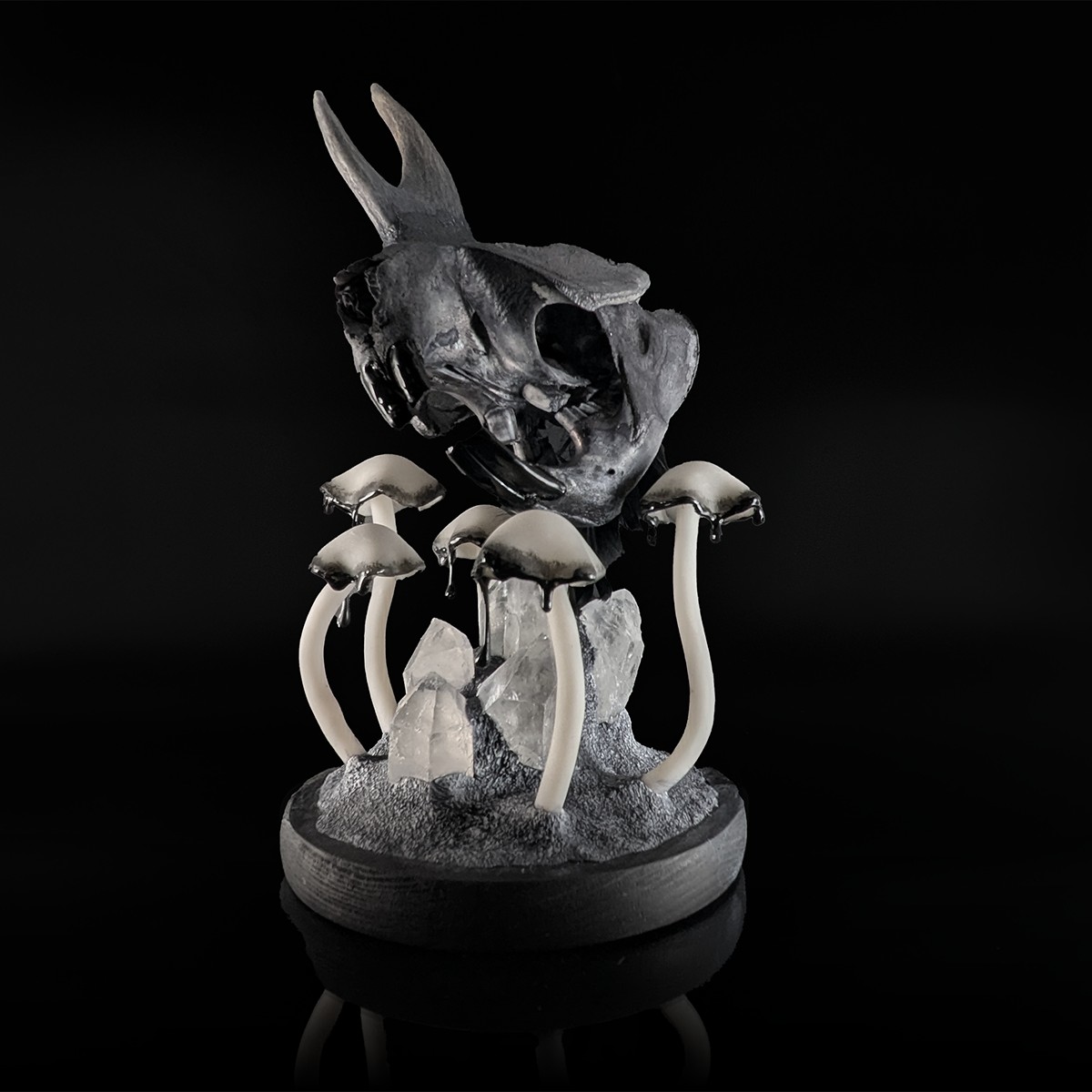 A piece of our Creature Collection this Monoceros Castor skull rises over crystals in a black setting with lights built into mushrooms, crystals and skull. Arranged on a 5.5 x 5.5 inch wooden base standing around 10 inches tall and takes three AAA batteries.