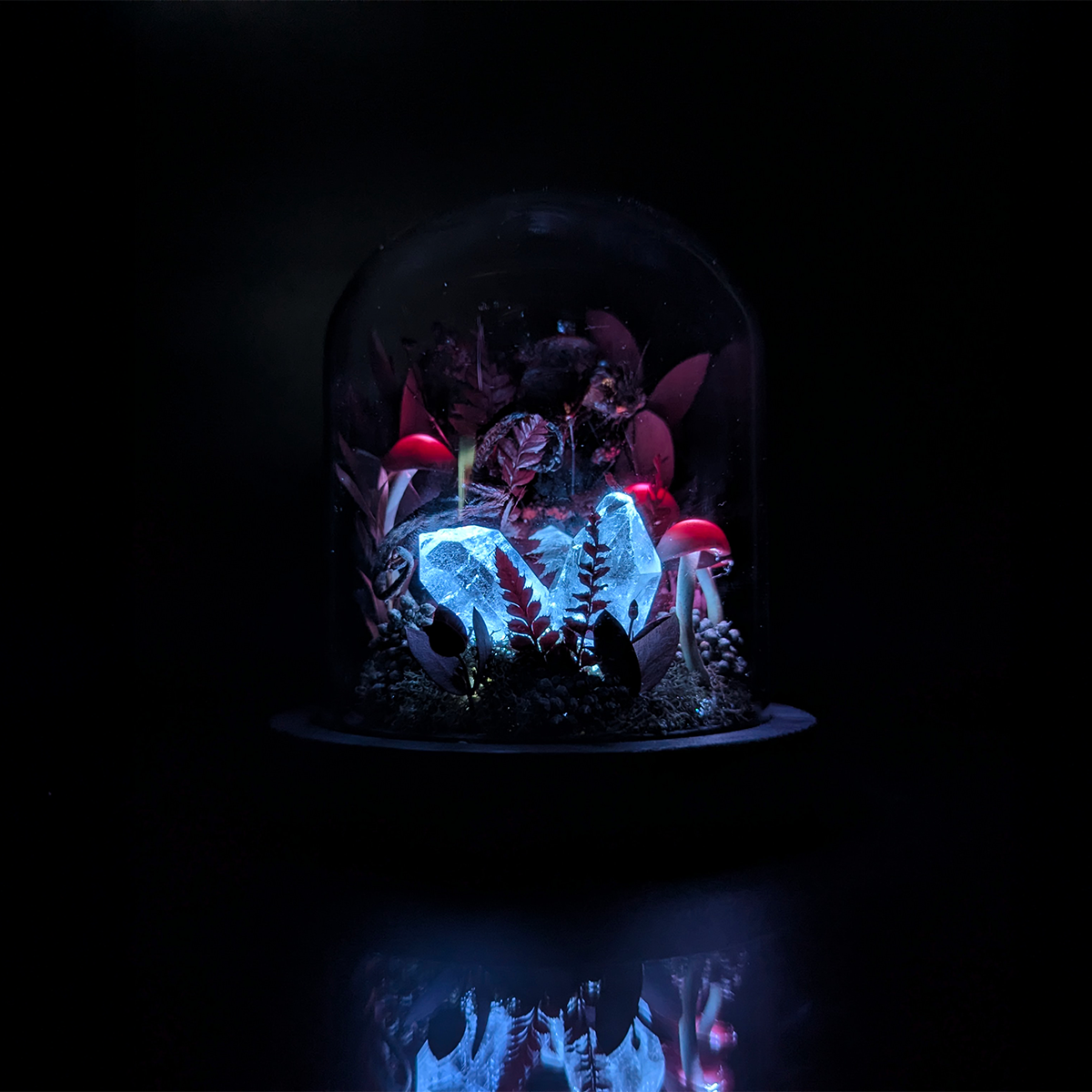 Skinned and mummified rat emerging over crystals placed in a black and red setting with lights. Protected by a glass cloche sitting 5 x 5 inch wooded base standing 5.25 inches tall all powered by AAA batteries.