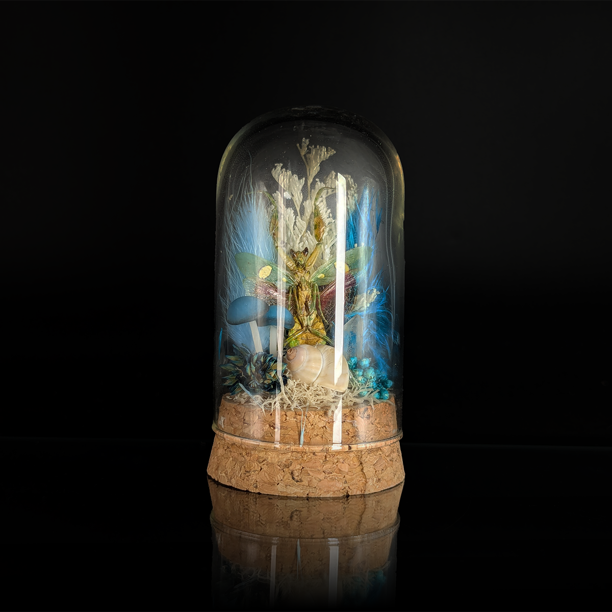 Flower Mantis placed in a nature white and blue setting. Enclosed in a 2 x 2 x 3.5 inch glass cloche with a cork base.