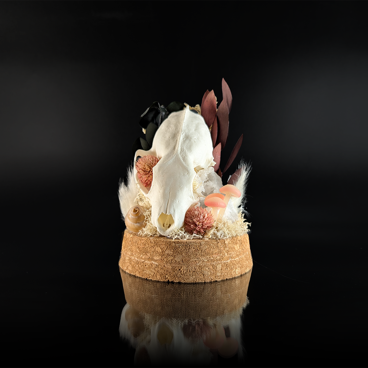 Marten Skull placed in a nature white and pink setting. Enclosed in a 3.25 X 3.25 x 4 inch glass cloche with a cork base.