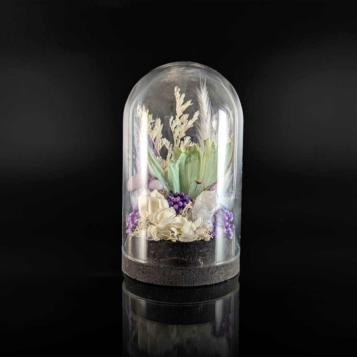 Tattered Luna Moth wing place in a nature white and purple setting. Enclosed in a 2.5 X 2.5 x 4 inch glass cloche with a cork base.