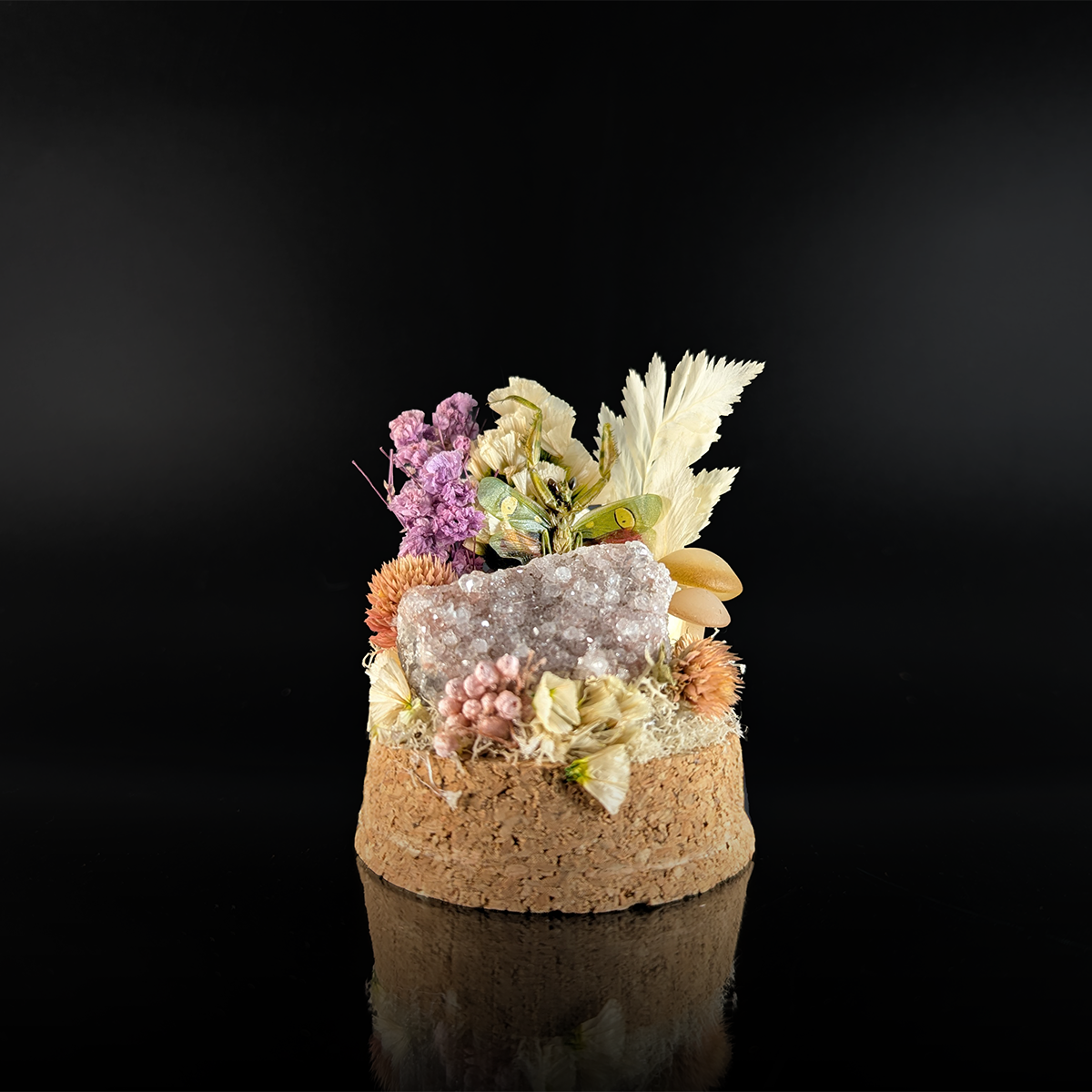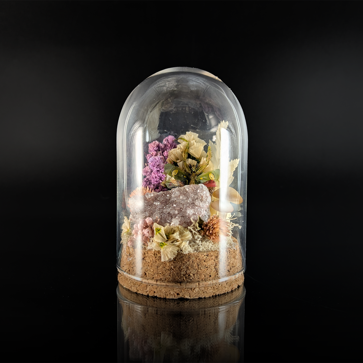 Flower Mantis placed in a nature white and purple setting. Enclosed in a 2.5 X 2.5 x 4 inch glass cloche with a cork base.